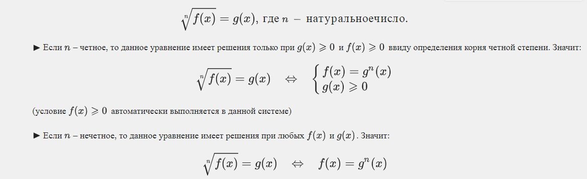Иррациональное уравнение - уравнение, содержащее переменную (чаще х) под знаком корня любой степени Стандартное иррациональное уравнение Задания ЕГЭ (№6), профиль Разберём решение некоторых уравнений: Сравните первое и второе условие системы. В первом говорится, что выражение 30 – 7х должно быть неотрицательным, а во втором, что значение этого выражения 16, а 16 уже число неотрицательное, значит первое условие автоматически соблюдено и не требуется дополнительное решение, то есть решается только уравнение 30 – 7х = 16 Если же вы «не дружите» с неравенствами и не совсем понимаете, откуда берутся условия системы, то можно просто возвести обе части в квадрат и обязательно сделать проверку: Предлагаем вам в решении следующего уравнения найти ошибку Вроде бы всё логично, но проверка показывает, что число 9 не является корнем уравнения Правильное решение Последние три уравнения решите сами. Ответы можете писать в комментарии. До встречи!