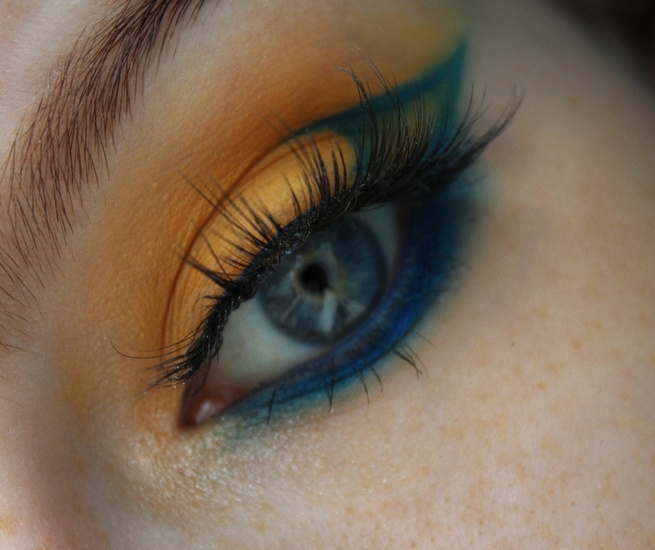Доброго времени суток, дорогие читатели Косметисты) Я продолжаю играться с оттенками из палитры августовского флешмоба. Предыдущие макияжи: сияющий макияж коричнево-голубой макияж Сегодня же мне пришла в голову идея создать вот такой яркий макияж: Предлагаю не медлить и скорее начать: За основу я беру оттенок Sunflower из давнишней палетки теней от Sephora collection. Затем матовыми жидкими тенями Рисую что-то наподобие стрелки. Соединяю верхнюю часть стрелки с ресничным краем (делаю это изогнутой линией) Подтушёвываю всё по направлению от внутренних границ к центру. И как всегда на этапе оформления нижнего века я долго не могла определиться, что мне делать: оставить «голым», оформить слизистую голубым карандашом, а кожу века желтым или же сделать и то, и другое сине-голубым... Из фото ниже, думаю, понятно, на чём же я остановилась. И мы вышли на финишную прямую! Осталось лишь: Добавить немного сияния во внутренний уголок глаза (специально взяла хайлайтер с золотистым отливом)Прокрасит