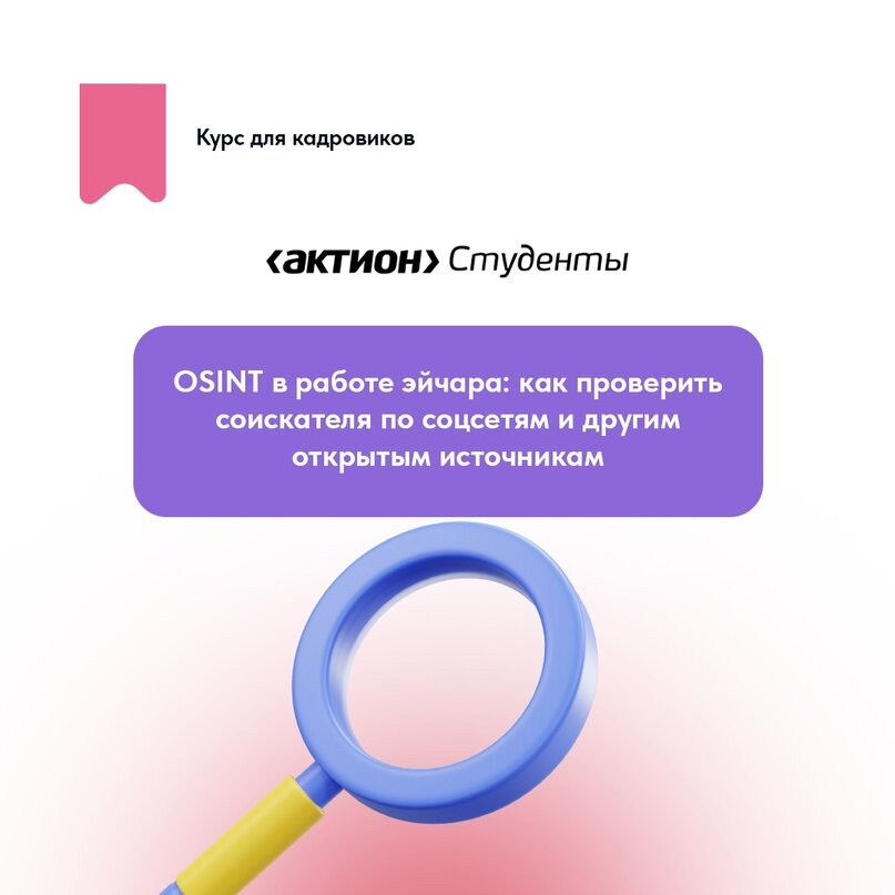 - Научишься собирать информацию о кандидате на вакансию при помощи поисковиков, соцсетей и официальных ресурсов