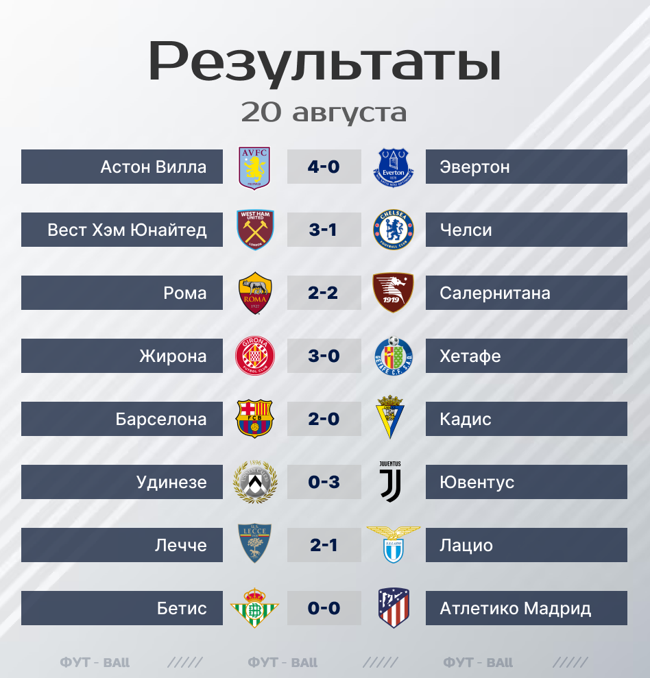 Рузельтаты матчей 20-ого августа.