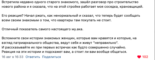 «Как на ранних этапах знакомства распознать, что с человеком лучше не иметь дел? При знакомстве с мужчинами, в первую очередь, и женщинами тоже. Читаю много про нарциссов и психопатов, но не особо помогает, только при длительном общении начинаю замечать звоночки. Может, стоит задавать конкретные вопросы, по которым можно будет распознать ред флаг сразу», — спросила девушка в одном из сообществ в ВК. Далее последовали весьма развернутые и недурственные, как мне показалось, ответы. Комментариев, достойных того, чтобы на них заострить внимание, было много, поэтому пост выйдет в нескольких частях. Женщины, думаю, меня поймут без вопросов. Ремарка для мужчин: вы знаете, что я стараюсь быть объективной. На очевидный бред про адаптивки или, например, феминитивы не к месту я говорю вам, что это бред. НО в этом конкретном случае я бы рекомендовала вам прислушаться к тому, что написали эти женщины, если вы, конечно, заинтересованы в построении длительных гармоничных отношений. Если нет — можете