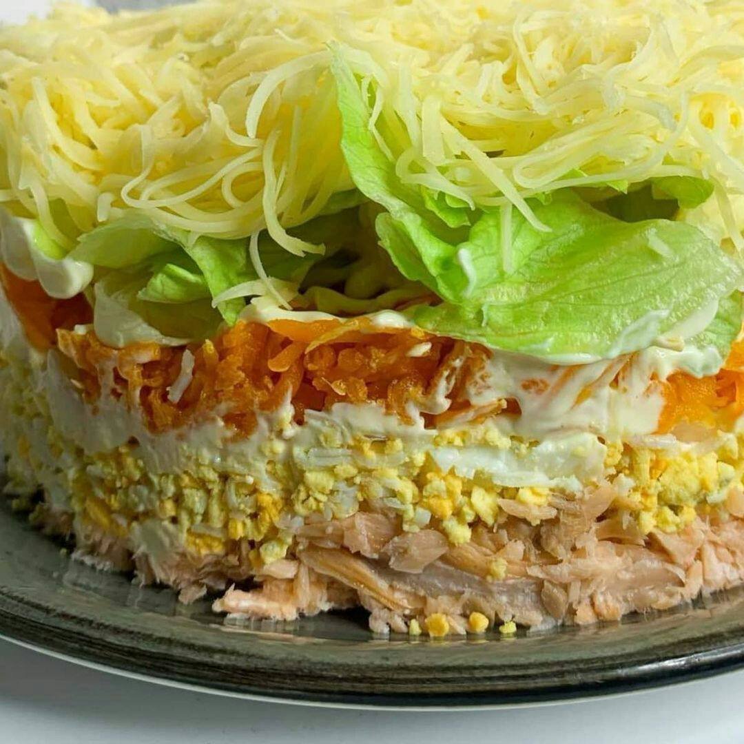 📖 Ингредиенты: - Копчёная горбуша - 200 г. (горячее копчение) - Лук - 1 шт. - Морковь - 2 шт. - Яйцо - 3 шт. - Сыр - 100 г. - Салат айсберг - 50 г. - Майонез - Уксус 9% - 1 ст л - Сахар - 1 ч. л. - Вода - 2 ст. л. 🧑🏻🍳 Приготовление: 1. Морковь и яйца отварить. Сыр, варёную морковь и яйца натереть на мелкой тёрке. Горбушу измельчить. 2. Лук нарезать мелкими кубиками и замочить в уксусе, воде и сахаре на 20 минут. 3. Собрать салат: горбуша, лук, майонез, яйца, майонез, морковь, майонез, айсберг, майонез, сыр. По вкусу можно посолить. Приятного аппетита друзья #слоеныйсалат #салат