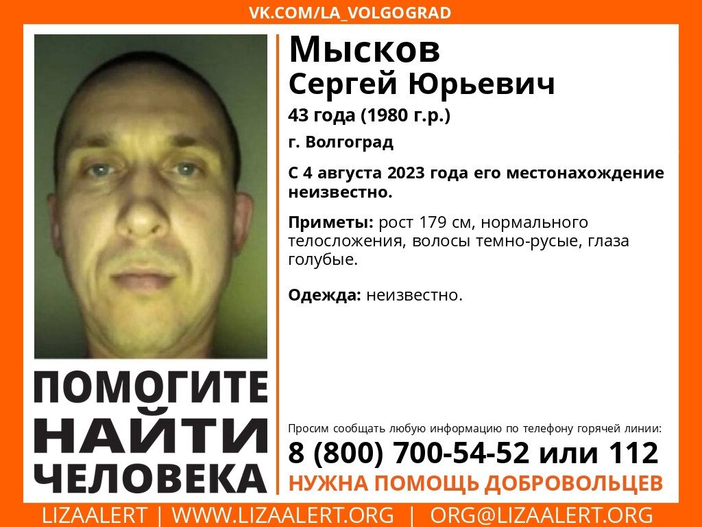 В Волгограде ищут бесследно пропавшего Сергея Мыскова. Информацию об исчезновении опубликовал поисковый отряд «Лиза Алерт». Мужчина бесследно исчез в областном центре 4 августа, с тех пор о нем никаких известий. При этом, никаких сведений о пропавшем Сергее Мыскове нет, в какой одежде он был в день исчезновения — неизвестно. Рост мужчины — 179 см, у него темно-русые волосы и голубые глаза. Пропавшего без вести ищут волонтеры и полиция, необходима помощь добровольцев. Известно, что 21 августа Сергею Мыскову исполняется 43 года. Напомним, с вечера 31 июля в Котово Волгоградской области исчез 67-летний Александр Нааб. В день исчезновения он был одет в красную футболку, темно-синее спортивное трико, тёмные галоши и чёрную кепку.