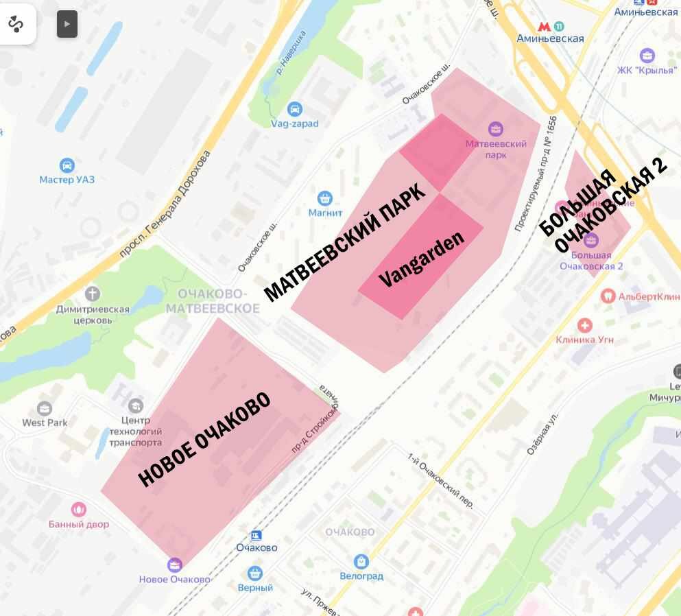ЖК Матвеевский парк – часть масштабной застройки от ПИК в Очаково-Матвеевское (ЗАО). На официальном сайте проекта ее (эту застройку) называют просто – Матвеевский кластер Вот так это выглядит на карте ЖК Большая Очаковская – это первая ласточка здесь. Стойка началась 2020 г., тогда же стало известно о двух этапах строительства (всего 6 (4+2) корпусов) проекта Сейчас, в августе 2023 г. корпуса первого этапа в стадии заселения. Второй этап – ключи (декабрь 2024 г. – май 2025 г.) ЖК Vangarden – это проект повышенного комфорта от ПИК (новая линейка жилья ПИК+) В январе 2021 г. несколько кварталов было выделено из общей массы застройки ЖК Матвеевский парк (см. карту выше) – это и стал ЖК Vangarden Корпуса эти скрыты от первых линий Аминьевского шоссе и жд линии Первый этап (8 корпусов с предчистовой отделкой) собираются сдать в мае 2024 г. ЖК Новое Очаково – застройка на месте Домостроительного комбината № 2, в полутора километрах от метро (рядом есть жд станция Очаково). В составе проекта