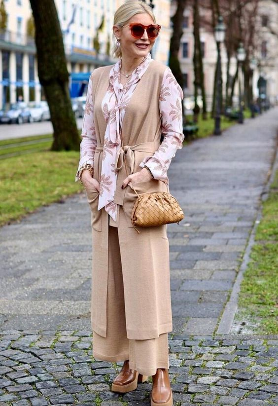 Какие цвета мы будем носить этой осенью? Вариантов не мало, но в возрасте после 50 лет, нужно выбирать не только с учетом требований моды. Дело в том, что есть цвета, которые омолаживают, а есть те, которые старят. И подбирать их нужно индивидуально. Есть, конечно, общие правила: светлые тона, как правило, освежают. А вот темные, создают невыгодный контраст, подчеркивая морщинки и другие возрастные изменения. Но нет правил без исключений, при достаточно контрастной внешности, темные тона могут отлично подходить, подчеркивая природную красоту. Розовый Розовые оттенки многие считают детскими, поэтому взрослые дамы редко выбирают их и напрасно. Но если подобрать подходящий оттенок, то розовый может заметно освежить лицо, сделать его визуально моложе. Не обязательно выбирать яркие тона розового, можно попробовать пастельные оттенки, сдержанные бежево-розовые и серовато-розовые тона. В примере – комплект, состоящий из бежевых широких брюк и розовой «двойки», в состав которого входит топ с а