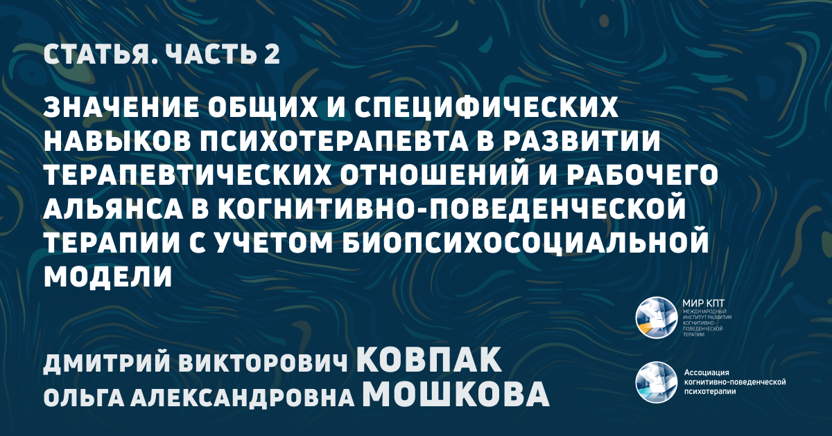 В статье рассматривается роль общих и специфических терапевтических навыков когнитивно-поведенческого терапевта в построении терапевтических отношений и создании рабочего альянса в когнитивно-поведенческой терапии с учетом биопсихосоциальной модели.
