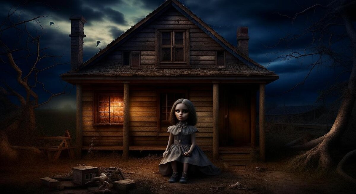 В маленькой деревне на окраине стоял старый дом, в котором никто не жил уже долгие годы. Люди говорили, что это место проклято, но молодая пара, решившая начать новую жизнь, решила игнорировать слухи. Они решили провести ремонт и восстановить дом. Во время чистки чердака, жена обнаружила старую куклу, прикрытую пылью и паутиной. Кукла была странной – с черными глазами, недвижимыми и зловеще сверкающими. Сначала пара не обратила на нее внимания, но вскоре начали происходить странные вещи. Вещи исчезали и появлялись в неожиданных местах. Звуки детской смеха раздавались по ночам из детской комнаты, хотя у них не было детей. Жена начала видеть кошмарные сны, в которых она была поглощена мрачной тенью и теряла сознание. Она начала чувствовать, что ее домом овладело что-то зловещее и невидимое. Однажды, просыпаясь посреди ночи, они услышали шаги по коридору. Они вышли из спальни и увидели, как дверь детской комнаты медленно открывается. Они вошли и увидели куклу, стоящую на полу, и глаза кук
