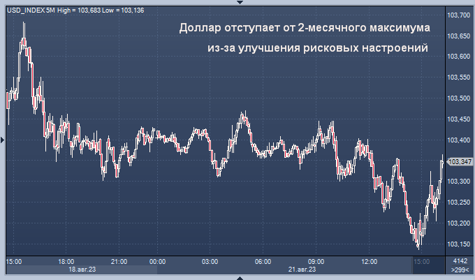 Юань растет за счет поддержки властей, но аусси и киви падают из-за разочарования мерами Китая по поддержанию экономики График индекса доллара интервалами в 5 минут Доллар упал с двухмесячного максимума в понедельник после пяти недель роста подряд, поскольку настроения в отношении риска улучшились в Европе, и внимание уже переключилось на симпозиум Федеральной резервной системы в Джексон-Хоуле, который стартует в пятницу. Индекс доллара, который измеряет курс валюты по отношению к шести другим основным валютам, в последний раз снижался на 0,2% до 103,18, но все еще близок к двухмесячному максимуму пятницы 103,68. "Склонность к риску кажется намного более устойчивой, чем в последние несколько недель, что, похоже, оказывает давление на доллар", - сказал Майкл Браун, рыночный аналитик Trader X, отметив, что европейские акции растут, а фьючерсы на Уолл-стрит указывают на позитивное открытие."По большому счету, движения довольно ограничены... Я бы не стал придавать слишком большого значения