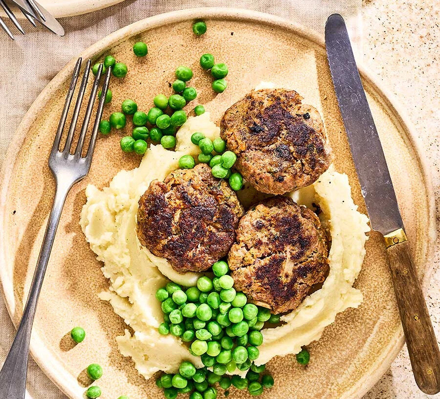 Ингредиенты: 1 луковица, натереть 50 г панировочных сухарей панко 400 г говяжьего фарша 1 кабачок, очищенный и натертый 1 морковь, натертая 1 яйцо, взбитое 1 зубчик чеснока, раздавленный или мелко натертый 2 чайные ложки сушеной смеси трав 1 чайная ложка вустерширского соуса 2 чайные ложки растительного масла горох и пюре для подачи (по желанию) ШАГ 1 Смешайте все ингредиенты, кроме масла, вместе в большой миске с 2 чайными ложками соли и перца. Используйте свои руки, чтобы убедиться, что все хорошо сочетается. Сформируйте из фарша 14-16 шариков, затем раскатайте в маленькие котлеты, похожие на гамбургеры, и охладите в течение 15 минут, если у вас есть время (это поможет котлетам сохранить свою форму). ШАГ 2 Разогрейте масло в сковороде на среднем или слабом огне и, как только оно станет горячим, обжарьте котлеты в течение 3–4 минут, затем переверните и жарьте еще 3–4 минуты до готовности. (Возможно, вам придется делать это партиями.) Когда они будут готовы, они должны быть готовы к