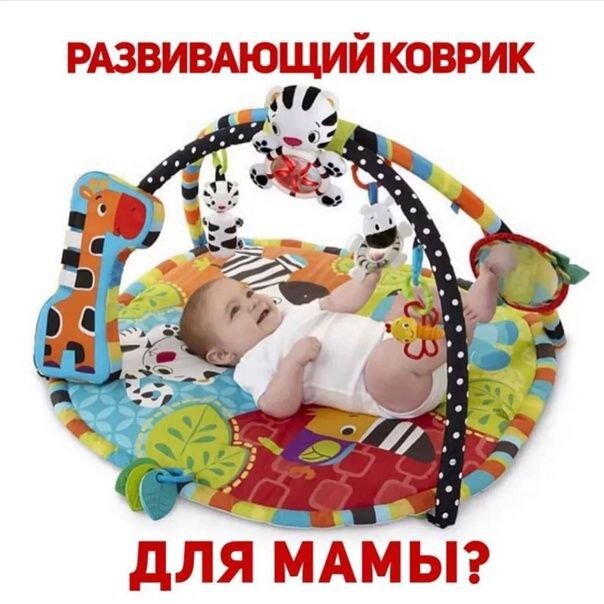 А для кого: себе или малышу? К чему я задал такой вопрос? 🤪 Давайте разберемся. Что видит этот малыш на фото 👇🏻, лежа на коврике? Как бы так поделикатнее выразиться: пятую точку котенка и нижнюю часть медвежонка? 🤣 При удачном стечении обстоятельств малыш достанет до игрушек рукой, правда, погрызть их не получится 😔 А ведь для детей раннего возраста один из основных каналов познания мира – это через рот. Придется вам веревочки у игрушек удлинить для этого. Но важно, чтобы игрушки были примерно на уровне талии ребенка, чтобы линия взгляда малыша была 30 градусов относительно горизонтали. Самое неприятное в подобных ковриках то, что они не стимулируют ребенка перевернуться на живот-зачем? Все интересное висит над тобой. Примеры «правильных» и «неправильных» ковриков ниже, смотрите :) Секрет в том, что и у «неправильных» ковриков можно поставить дуги с наклоном – и одним вашим движением коврик станет «правильным» 🤗 А коврик, где дуги сверху (первое фото), больше на мам рассчи