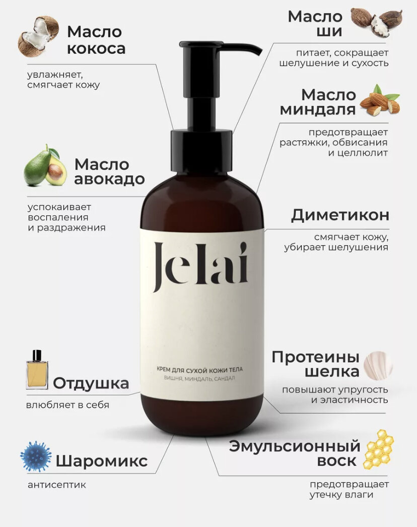 Крем для тела " Желай " с маслами натуральный - это обязательный атрибут заботы о коже в холодное время и круглый год. Гель для рук увлажняющий интенсивно восстанавливает и смягчает, делает кожу мягкой и увлажненной, упругой и сияющей. В основе лосьона для тела только натуральные компоненты, которые повышают тонус и устраняют раздражение, заживляют ранки и регенирируют, способствуют восстановлению и удержанию влаги в клетках. Желай крем для ног питательный подходит для всех типов комбинированной и нормальной, но особенно эффективен для сухой и чувствительной коже стоп и пяток. Увлажняющий, успокаивающий крем после эпиляции ног и голеней, питает и увлажняет кожу ног, рук, всего тела. Полностью впитывается и не оставляет ощущения стянутости, не скатывается и не создает эффект жирной пленки, аналогичен по действию известных корейских брендов. Универсальный баттер легко наносится и дарит синие, питание и защиту. Крем-масло имеет стойкий приятный и ненавязчивый аромат сандала и корицы будт