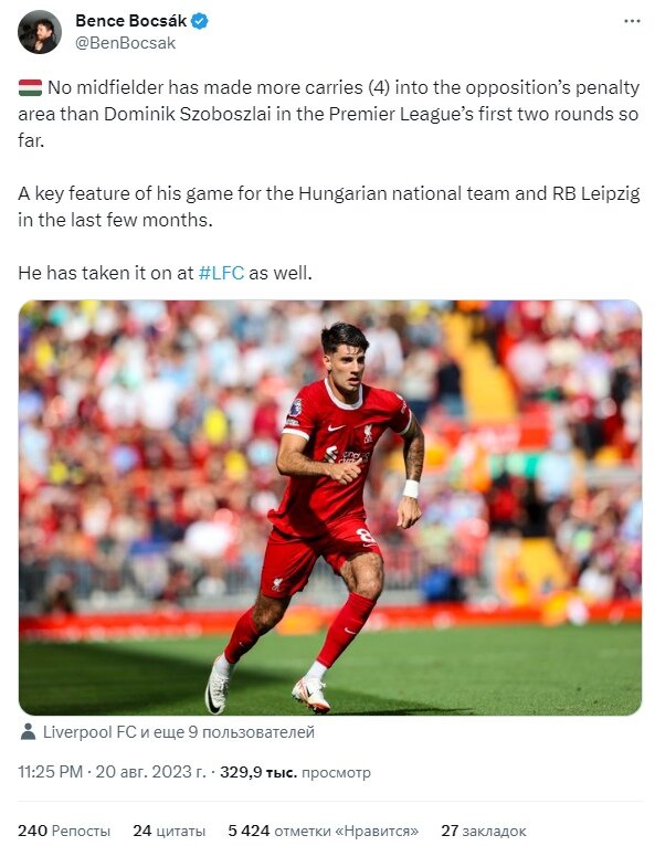 Надо продолжать в том же духе. Доминик Собослаи покорил болельщиков «Ливерпуля» своим выступлением в матче против «Борнмута», где «Ливерпуль» победил со счетом 3:1. Он выглядел невероятно заряженным на протяжении всех 90 минут, и был настоящей звездой центра поля. Его назвали игроком матча, и цифры демонстрируют, что это заслуженно: 93% точность передач; 4/5 длинных передач; 5/8 выигранных единоборств; 5 возвратов владения. Несмотря на то, что пока что он провел всего несколько матчей в Англии, венгерский полузащитник уже лидирует по одному ключевому в Премьер-лиге. Собослаи доставил мяч в штрафную соперника больше раз (4), чем любой другой полузащитник АПЛ. Большая часть этих забегов пришлась на игру против «Борнмута», где он неоднократно обходил соперников, единолично создавая возможности для атаки. Клопп по-тихому подписал себе настоящий бриллиант этим летом 💎