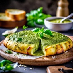 Ингредиенты: – 500 г муки – 1 чайная ложка сухих дрожжей – 250 мл теплой воды – щепотка соли – оливковое масло – 40 г тертого пармезана – горсть свежей петрушки – горсть базилика – зубчик чеснока – кедровые орехи Приготовление: 1. Смешайте муку, дрожжи и соль в большой миске. Добавьте теплую воду и оливковое масло. Замесите тесто, пока оно не станет гладким и эластичным. 2. Разделите тесто на две части и сформируйте две круглые булочки. Положите их на противень, застеленный пергаментной бумагой. Накройте полотенцем и оставьте на 30 минут. 3. Тем временем, приготовьте песто. Смешайте базилик, петрушку, чеснок и кедровые орехи в блендере до получения однородной массы. Добавьте тертый пармезан и продолжайте смешивать до получения пасты. 4. Слегка присыпьте булочки песто и натертым пармезаном. Выпекайте в духовке, разогретой до 200 градусов, в течение 20-25 минут, пока булочки не станут золотистыми и хрустящими. 5. Подавайте фокаччу горячей, нарезав на ломтики