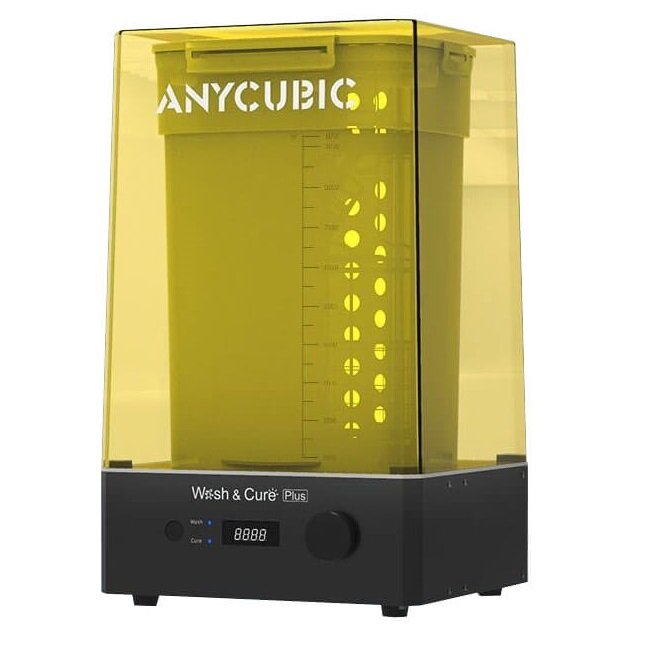 УФ-камера и мойка Anycubic Wash and Cure Plus - полимеризационная камера увеличенного размера, предназначенная для очистки и дополнительного отверждения моделей из фотополимерной смолы, позволяющая промывать и сушить изделия размером 19х12х24,5 см. К её преимуществам относятся размер резервуара в 8,5 л., подвижная стойка с 20 светодиодами с длиной волны 405 нм для равномерного засвечивания изделия сверху, наличие поворотного контроллера для определения параметров и удобный ЖК-дисплей управления.
