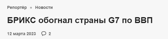 Но есть еще один миф, активно распространяемый в России и касающийся экономики БРИКС. Он заключается в том, что страны БРИКС по своему экономическому развитию, главному показателю экономики - ВВП уже обогнали страны G7. Об этом массово пишут российские СМИ и многие блогеры.
