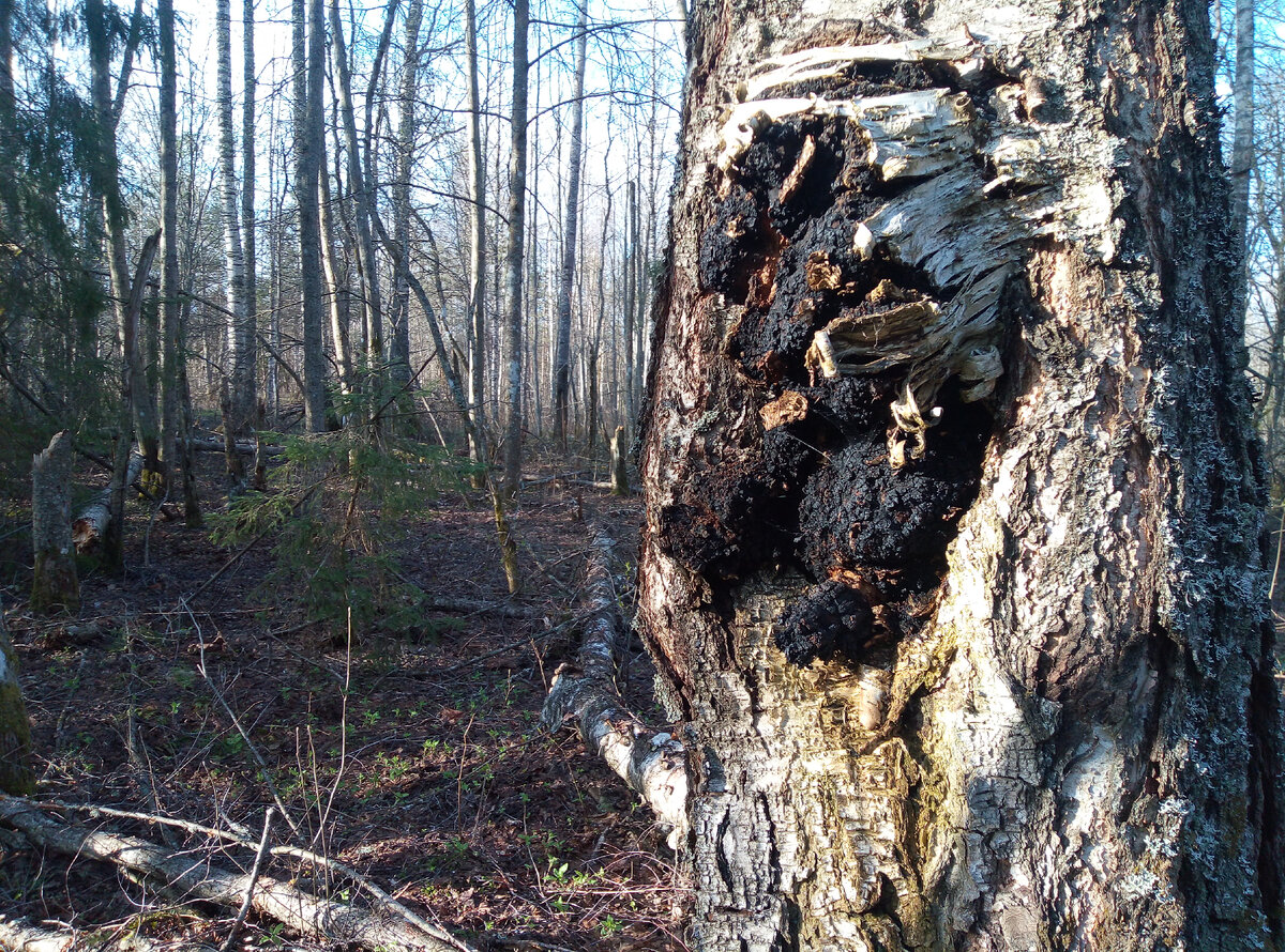 Да, да, уже рассказывал про однажды замеченный ляп с аптечной упаковкой чаги. Но то скорее юмористическая статья, про неграмотность дизайнеров и прочих прикладывателей картинок. А сейчас речь пойдет про внешний вид гриба Inonotus obliquus, который мы по традиции называем чагой. Но на самом деле, то, что мы собираем (по правилам, конечно же) это стерильный нарост - завершающая стадия развития гриба. Википедия ошибочно называет его "плодовым телом", но это не так. Плодовое тело ее появляется чуть раньше и выглядит как бугорок, вздутие на поверхности березы. На завершающей стадии из под лопнувшей коры можно видеть течение бурой жидкости: Так выглядит то, что предшествует появлению стерильного нароста. Это и есть сама чага, ее "плодовое" тело, несущее споры. Она развивается под корой и практически не заметна, но уже можно предсказать появление на этих деревьях на следующий год стерильных наростов. Того, что обычно и называют чагой. ________________________ Вот здесь ссылка на исследование