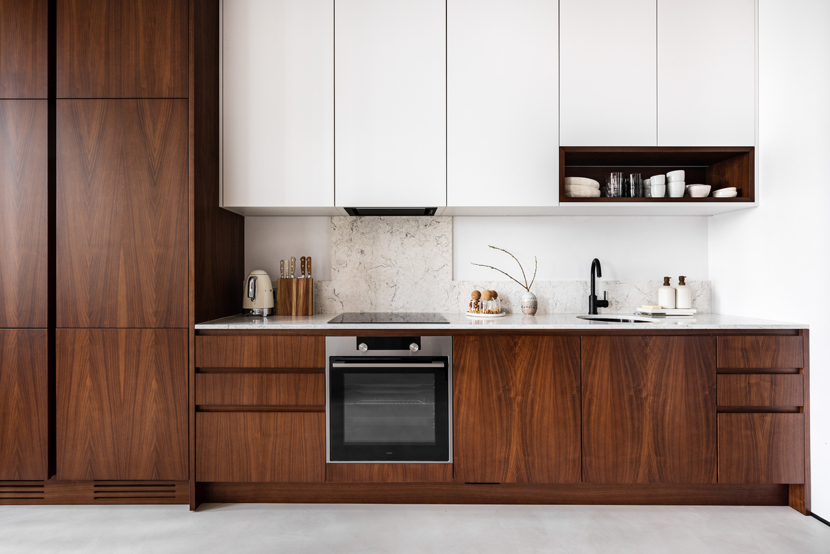 Дизайнер Валентина Дружинина создала теплый тактильный интерьер для московской квартиры в ЖК «Счастье на Пресне». Студия площадью 45 кв. метров принадлежит талантливому модельеру и владелице собственного бренда одежды Ангелине Эрф. Она хотела обрести место, где можно забыть о быстром городском ритме и остаться наедине с собой. «Бесспорным достоинством квартиры был вид из окна и высокие трехметровые потолки. Достаточно было поставить кресло, чтобы наслаждаться Москвой и меняющимся светом, как в театральной ложе», — рассказывает дизайнер. Ангелине нужна была квартира с минимумом стен, максимумом света и удобной системой хранения. Интерьер с выразительными формами и линиями стал отражением ее характера, любви к природным фактурам и философии less is more. «Мы убрали все стены, включая санузел, вернув их в более щедрых пропорциях. Зонировать пространство помогли ритмичные деревянные перегородки от Uclad», — рассказывает Валентина. Микробетонные полы с подогревом и гладкая штукатурка создал