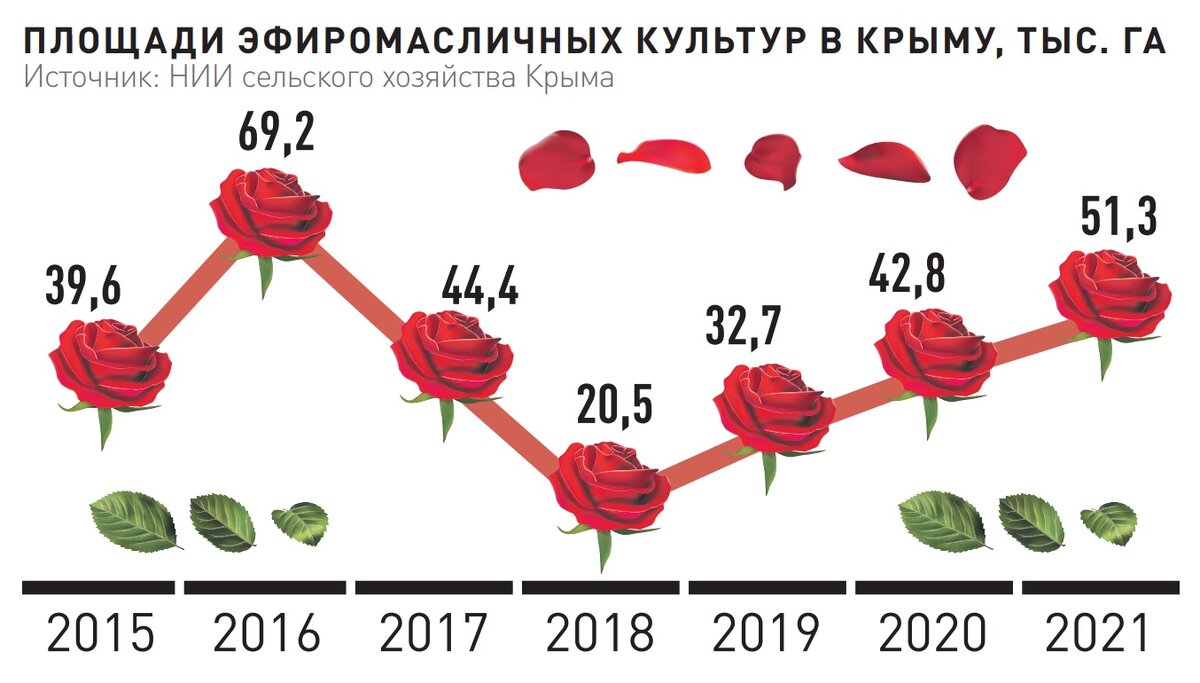 — Посадки многолетних насаждений ежегодно увеличиваются, растет и количество собранного сырья. На закладку гектара эфиромасличной розы выделяется около 450 тысяч рублей, лаванды — больше 300 тысяч. Субсидированию подлежит и закладка маточников этих культур, — рассказал министр сельского хозяйства Крыма Андрей Савчук. — В 2023 году площадь под узколистой лавандой, с которой уже можно получить урожай, и под той, что только вступит в плодоношение, составляет более 800 гектаров.
