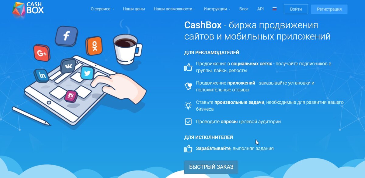 Cashbox – биржа продвижения сайтов и мобильных приложений, где заказчики могут продвигать приложения, сайты и аккаунты в соцсетях, а исполнители могут зарабатывать на этом. Причем задания здесь достаточно простые, а значит, такой заработок подойдет любому человеку, в независимости от его возраста и образования. Варианты заработка на Cashbox Заработать здесь можно следующими способами: Оплата заданий на Cashbox С учетом того, что задания достаточно легкие и не требуют определенных знаний, оплата здесь невысокая, и зависит от категории заказа: Зависит доход от количества выполненных заданий – чем больше времени вы будете уделять работе, тем больше ваш заработок и от количества аккаунтов в социальных сетях – чем больше аккаунтов, тем больше денег вы сможете заработать. Помимо заработка на выполнении заказов, на Cashbox можно дополнительно получать прибыль по партнерской программе. Так, например, если пользователь зарегистрируется по вашей реферальной ссылке в качестве рекламодателя, то