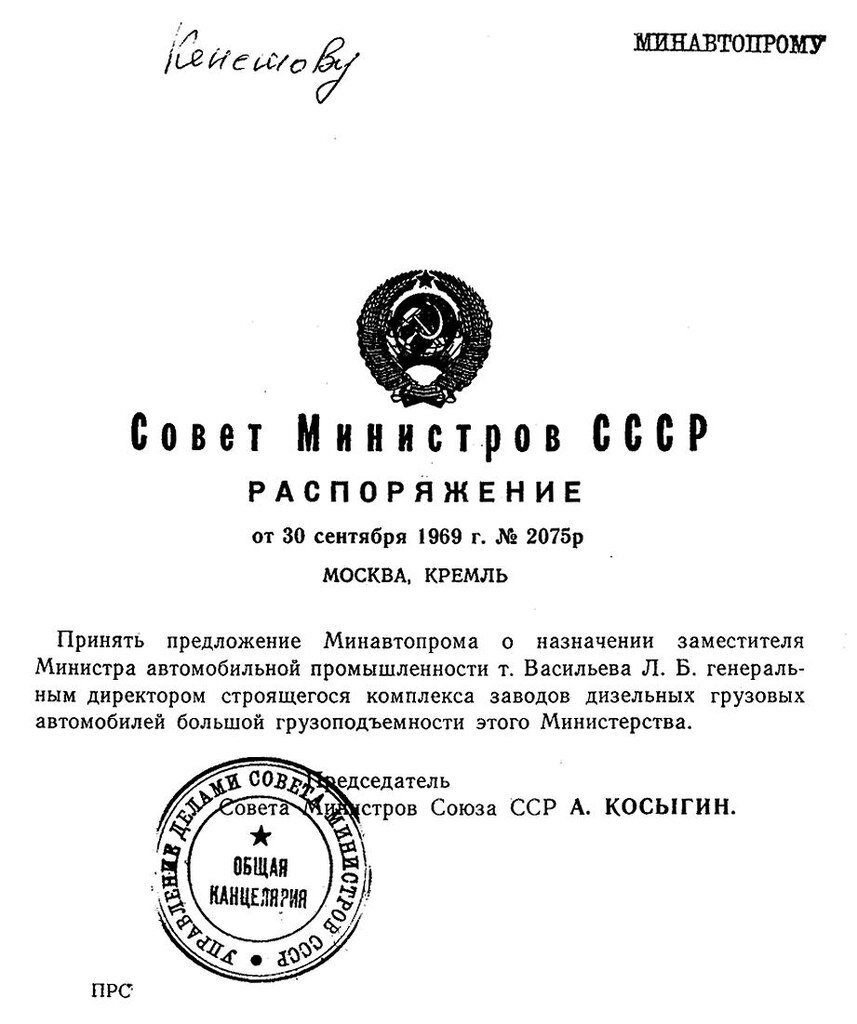 Сегодня хочу вам показать два документа разных лет, между которыми произошли грандиозные события в истории не только Камского автомобильного завода, не только города Набережные Челны, но и всей нашей страны. Внизу распоряжение Совета Министров СССР от 30 сентября 1969 года о назначении Васильева Льва Борисовича генеральным директором КАМАЗа. Внизу один из последних приказов, подписанных Васильевым Л.Б, как генеральным директором КАМАЗа 12 июня 1981 года.