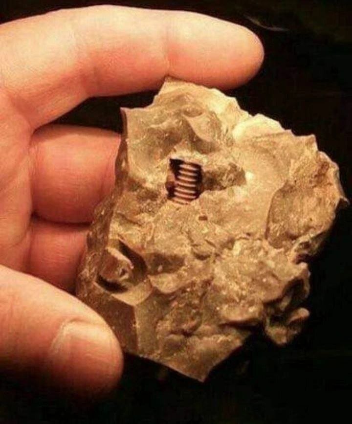 Есть множество археологических находок, которые наука не может понять, например, винт возрастом 300 миллионов лет, найденный в России в 1990-х годах.История любопытна. Российские ученые рассказывают, как проводили анализ после падения метеорита в Калужской области, когда среди остатков недавно упавшего метеорита обнаружили странный объект, напоминающий современный винт. Окаменелость винта имеет размеры около 2 см в длину и была обнаружена в ходе экспедиции , проведенной 7 октября 1996 года исследовательской группой « Космопоиск» Удивительное дело, когда после анализа палеонтологов было обнаружено, что возраст камню было от 300 до 320 миллионов лет. Как поясняется в статье в российском журнале «Огонек», останки скалы были проанализированы с помощью рентгеновских технологий, и неожиданностью стало то, что внутри скалы был обнаружен как минимум еще один винт