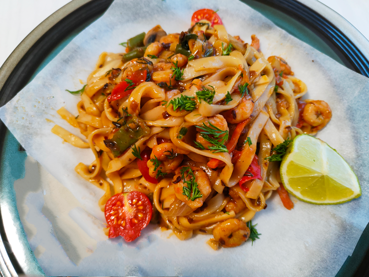 Очень простое и вкусное блюдо подойдёт тем, кто стремиться похудеть и ли же приверженец правильного питания. Ингредиенты для приготовления 2 порций: Пшеничная лапша 200 гр Креветки очищенные замороженные (небольшие) 250 гр Репчатый лук 1/2 ч Сладкий перец 1/2 ч Морковь 1/2 ч Помидор 1 шт. Стручковая фасоль 100г Соевый соус 2 ст.л Шампиньоны 3 шт (средние) Рисовый уксус 1 ст.л Соль и специи (по вкусу) Зелень (по желанию) Масло подсолнечное (или кокосовое) для жарки Готовим: Очищаем, промываем и нарезаем все овощи тонкими ломтиками. Помидор очистить от кожуры и нарезать кубиком. Креветки достать из упаковки. Тем временем ставим воду под лапшу. Когда вода закипит, солим и отвариваем лапшу т.к. написано в инструкции на упаковке. В сковороду с разогретым маслом опускаем все овощи и креветки. Обжариваем все на среднем огне, до полной разморозки креветок. Добавляем, соль, специи и рисовый уксус. Перемешиваем. Добавляем соевый соус и снова перемешиваем. Добавляем готовую лапшу в сковороду.
