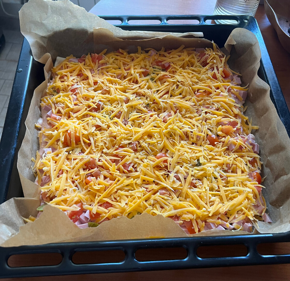 Не знаю как вы, но мой жених и гости нашего дома просто обожают домашнюю пиццу и любую выпечку с нашего стола🫣 Хочу поделиться очень простым рецептом, которые многие знают и любят☺️ Процесс готовки составляет около 40 минут. Ничего сложного, быстро и безумно вкусно. Для начала продукты, которые вам понадобятся: На противень я кладу пергаментную бумагу, смазываю ее сливочным маслом. Размораживаем тесто до полной мягкости, раскатываем до нужной нам формы. На тесто хаотичными движениями я наливаю кетчуп и майонез, ложкой размазываю по всему тесту( особое внимание бортикам) Далее нарезаю колбасу и огурец( кубик, саломка, как нравится), смешиваю и выкладываю на смазанное тесто, придавливая в него, так начинка будет не только сверху, но и немного в тесте. Добавляю черри разрезанные на 4 части сверху и обильно посыпаю тертым сыром🤤 Духовой шкаф у всех разный, по-этому время может отличаться, по истечению 30-40 минут проверяйте готовность пиццы вилкой или ножом. По тесту будет видно