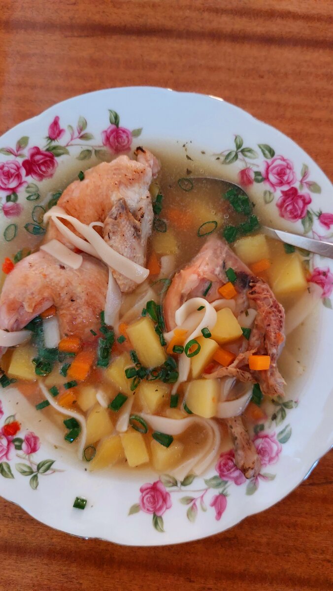 Привет, дорогие диетирующие) Если вдруг чем - то объелись, как я пирожками, и сорвали жкт, то прошу к тарелке супа. Лёгкий, но в тоже время сытный, аппетитный суп. Перепелки очень хороши, дают ароматный, вкусный бульон и сами чудесные на вкус) ** Что нужно - * Две перепелки * три небольшие картошки * одна морковь * одна луковица * одна столовая ложка растительного масла * одна чайная ложка сухой паприки кусочками * соль, лавровый лист * полтора литра воды * зелёный лук по вкусу * рисовая лапша ручной раскатки - горсть ** Что делать - * перепелок, готовых к кулинарной обработке, разрезать попалам, посолить и слегка обжарить * луковицу почистить и обжарить целиком, вместе с перепелками * овощи нарезать некрупно * сложить в кастрюлю овощи, перепелки, лук, добавить воду и поставить варить, на среднем огне * пены почти не будет, самая малость. Пену снять * добавить соль, паприку, лавровый лист, варить на небольшом огне, до готовности овощей. Лук вынуть, он уже не нужен * добавить лап
