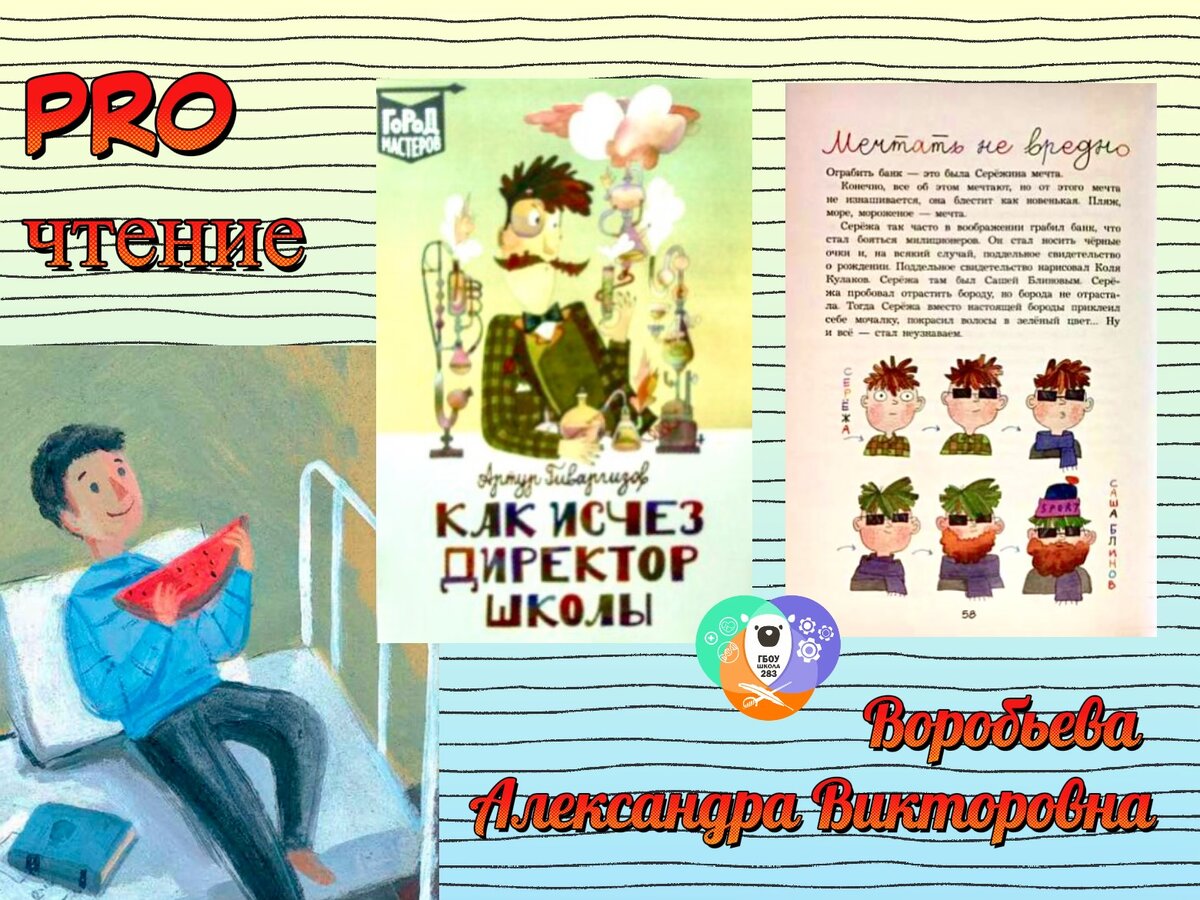 Традиционная авторская колонка от методиста нашей школы, журналиста с многолетним стажем, Александры Викторовны Воробьевой https://vk.com/sanechka78. Лето стремительно движется к концу. Скоро 1 сентября. Для кого-то самое первое, для кого-то уже завершающее долгий школьный марафон. Поэтому для создания предпраздничного настроения предлагаю отличную книгу детского писателя Артура Гиваргизова «Как исчез директор школы». Сборник юмористических школьных рассказов покажет с неожиданной стороны тех, кого мы привыкли считать строгими и неприступными, - учителей и директора школы. Ну кто бы мог подумать, что педагоги точно так же мечтают поспать на уроке, теряют документы и бездельничают?! Да-да, оказывается, учителя не отстают от учеников, часто сами оказываясь в смешных ситуациях: пишут формулы на заборе, жуют парты, наблюдают в подзорную трубу за хулиганами. Родители, как всегда, пишут сочинения, а еще проводят допросы и испытывают чудодейственные препараты «Взбодрин», «Соновит», «Мозгови