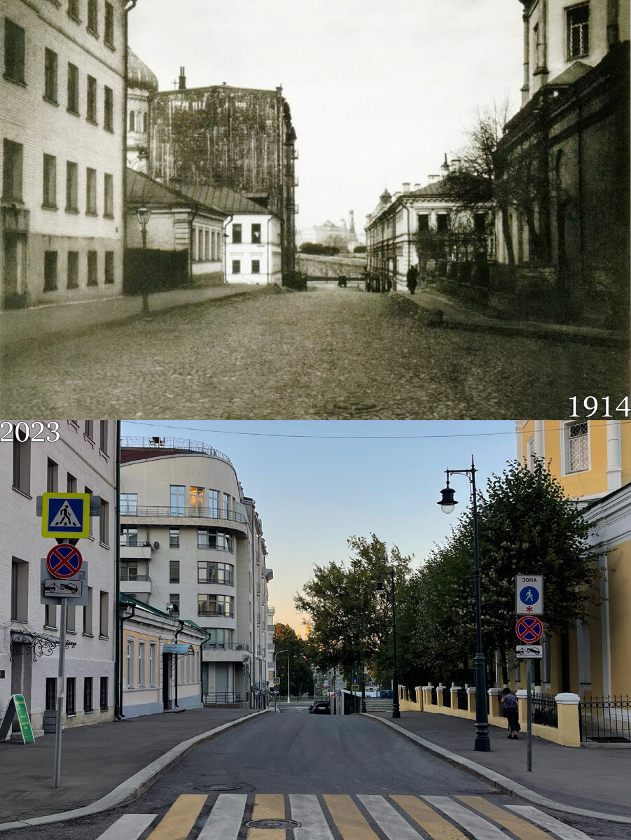 1) 3-й Обыденский переулок В правой части кадра виднеется сохранившаяся церковь Ильи Обыденного. Храм начала XVIII века, за свою историю ни разу не закрывался! Вдали можно увидеть колокольню Ивана Великого. Интересно видеть на этом коллаже осколки сохранившего прошлого. 2) Улица Пречистенка Классным снимок получился! На переднем плане в кадр попал известный дом, где реставраторы раскрыли надпись периода НЭПа «артель Хлебопек булочная». До революции тут тоже работала булочная. Кстати, тут сейчас тоже планируют открыть ее.