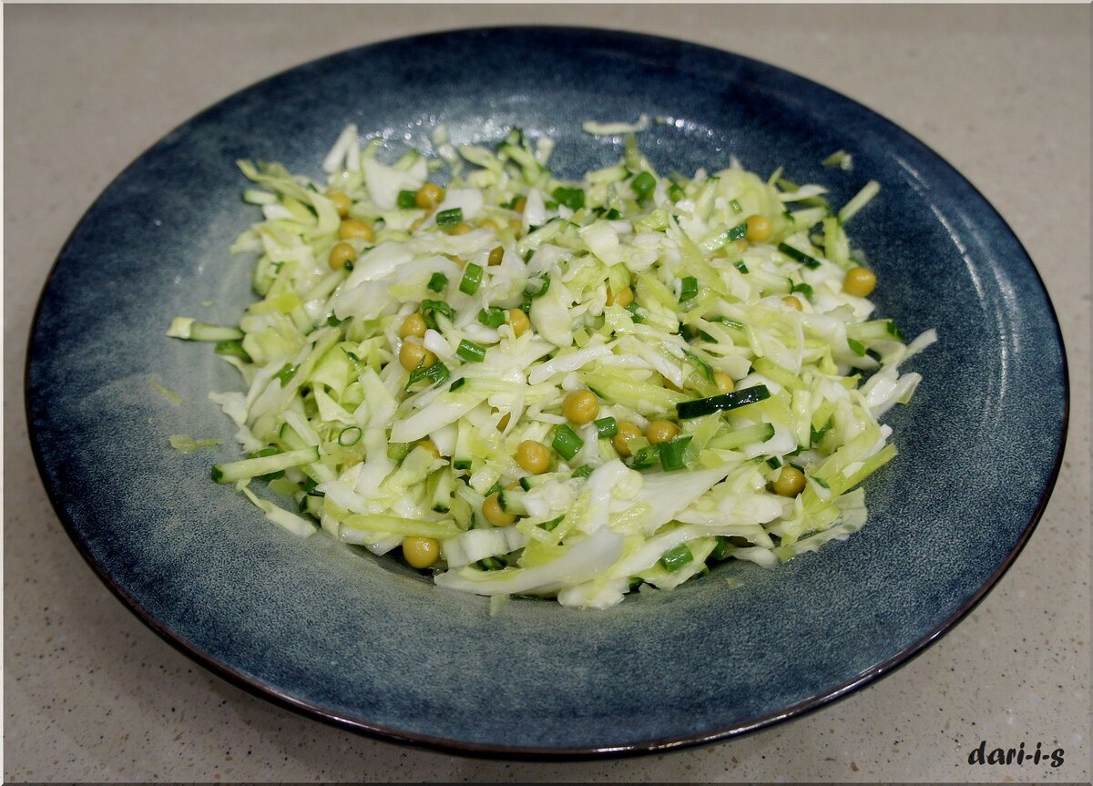 Салат из капусты с огурцами и зеленым горошком. Вкусно и полезно.