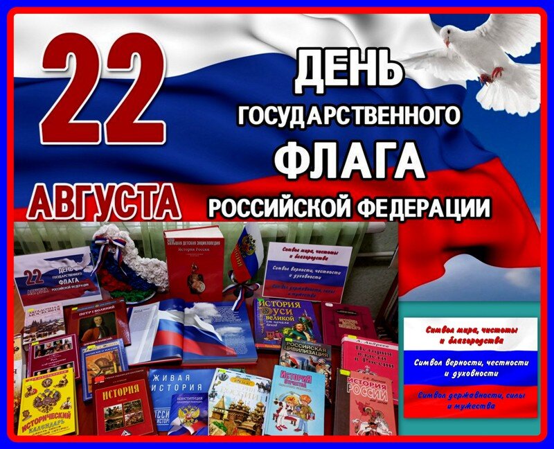Российский флаг-к победам смелый шаг! Ежегодно 22 августа в России отмечается День Государственного флага Российской Федерации. Трехцветный стяг неразрывно связан со становлением Российского государства, он стал символом военных побед и достижений, а так же символом единства страны. Сегодня флаг России — «государственный триколор» — официальный государственный символ, наряду с гербом и гимном Российской Федерации. Считается, что впервые бело-сине-красный флаг был поднят в период царствования Алексея Михайловича на первом русском военном корабле «Орёл». Законным же «отцом» триколора признан Петр I. 31 января 1705 года он издал Указ, согласно которому «на торговых всяких судах» должны поднимать бело-сине-красный флаг, сам начертал образец и определил порядок горизонтальных полос. По одной из версий, белый означает свободу, синий — Богородицу, покровительствующую России, крас