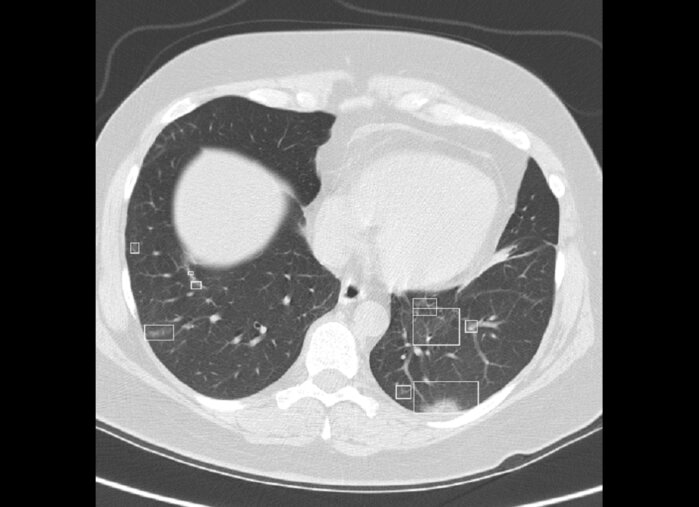 - алгоритмы автоматически распознают мелкие узловые новообразования в лёгочной ткани;