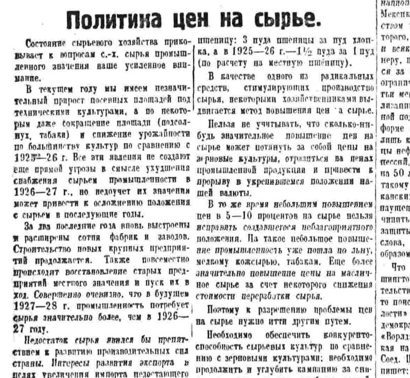 Сущность вопроса о ценах на сырье скрывается не в низком уровне цен на сырье, а в высоких розничных ценах, по которым производитель сырья вынужден был покупать хлеб и промтовары зимой и весной 1925—26 г.
