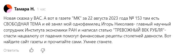 В комментариях одна из читательниц моего канала выразила мне претензию, что я тут пишу "сказки", и предложила "стать умнее", прочитав конкретную статью в газете "Московский комсомолец" на тему укрепления рубля, которую написал главный научный сотрудник Института экономики РАН.