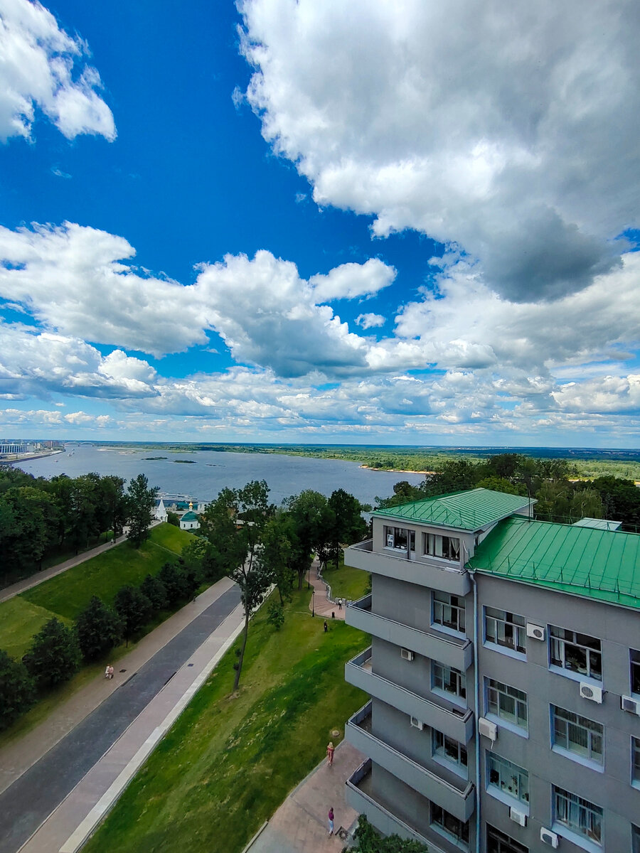 В самом сердце Нижнего Новгорода расположена лучшая, на наш взгляд, смотровая площадка города. Дочитав эту статью до конца, Вы узнаете, что это за площадка. Капля истории для антуражу. Наши дни. На наш взгляд, именно восстановленная Колокольня Спасо-Преображенского кафедрального собора, является лучшей смотровой площадкой Нижнего Новгорода! Кстати, посетить ее можно ежедневно. КАК ДЕЙСТВУЕМ. 1. За 150 рублей покупаем билет в кассе, расположенной на входе в Колокольню. 2. По билету проходим через турникеты в лифт, на котором поднимаемся наверх. 3. Выходим из лифта и по металлической винтовой лестнице поднимаемся на смотровую площадку. 4. Наслаждаемся с высоты птичьего полета великолепными панорамными видами на историческую часть Нижнего Новгорода - территорию Кремля с его стенами и башнями, величественную Волгу и знаменитую Нижегородскую Стрелку - место слияния Волги и Оки. 5. Рассматриваем невероятные колокола, коих на Колокольне аж 15 штук. Между прочим, самый большой ко