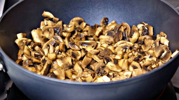 3. Добавьте грибы и обжарьте их до мягкости. Посолите и поперчите по вкусу. Остудите начинку.