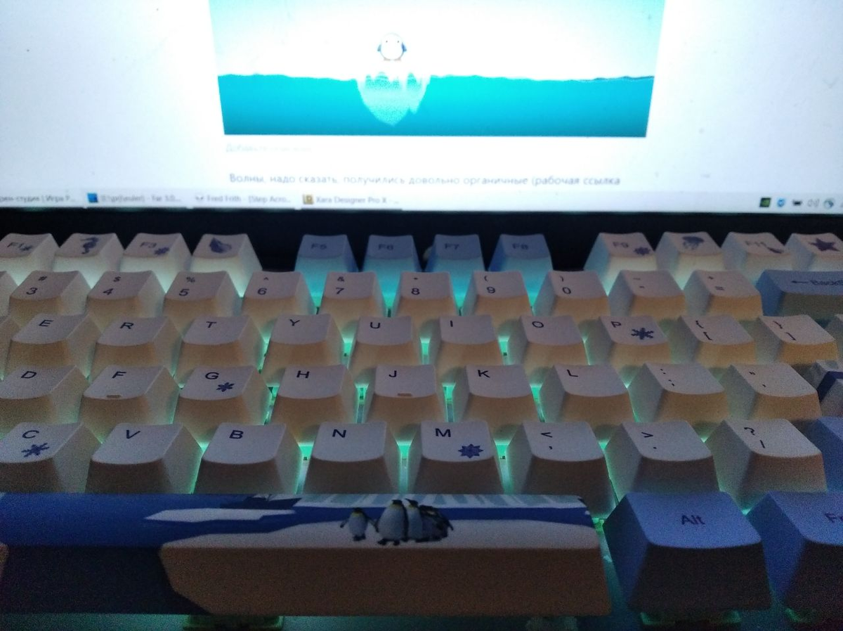 Как я сообщал ранее, прикупил клавиши с пингвинами, чтобы закончить игру про пингвина. Сейчас этими клавишами и пишу :) Игра называется Pengu5, потому что Pengu это сокращённо Penguin, а 5 это ремейк Flash-игры на HTML5. Всё началось с симуляции волн, и сейчас я туда заглянул и увидел какие-то не вполне очевидные цифры, так что попробую всё описать и заодно вспомнить. Итак, ключевая особенность игры это плавание льдины по волнам. Волны, надо сказать, получились довольно органичные (рабочая ссылка будет в конце), но это не физически достоверная симуляция. Для нужд игры её достаточно. Как сделать волну? Берём обычную синусоиду: У неё есть амплитуда – это высота волны. И частота – это, соответственно, величина, обратная длине волны, а длина волны зависит от скорости распространения. Собственно, это всё, вот она, волна :) Чтобы сделать волну более похожей на воду, нужно просто взять несколько синусоид с разными амплитудами и частотами и сложить их: Далее, нужно заставить волны двигаться. Н