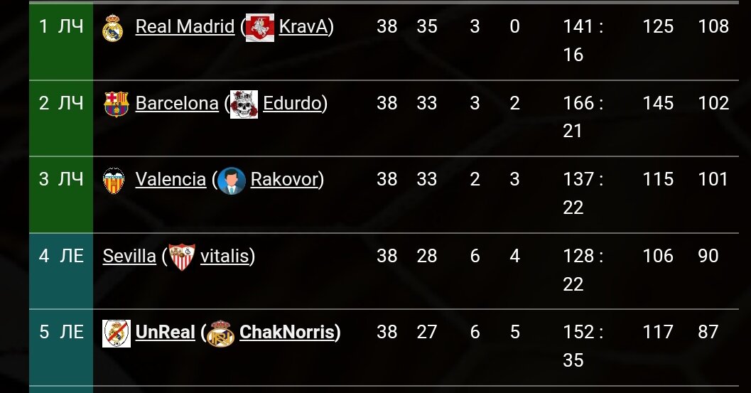 Первая пятерка перед вами! Мы снова видим, что чемпионом Испании второй год подряд становится Реал Мадрид! Аплодисменты от меня, лишь трижды за сезон Реал потерял очки в сезоне (в играх с Барселоной, Валенсией и мной). Барселона вновь вторая. Жалко очень за Эда, пожелаем ему удачи взять Ла Лигу в следующем сезоне. "Летучие мыши" (тобишь Валенсия) сменили деревянные медали на бронзовые, и были в шаге от серебряных, но не хватило 1 очка... Безусловно, для Валенсии сезон прошел в чемпионате более, чем неплохо, пожелания удачи на следующий сезон не забываю добавить. Севилья отстала в этом сезоне от лидеров. 11 очков разрыва это очень большой разрыв, в следующем сезоне для Севильи необходимо не допустить такого большого разрыва. Про себя как-то неловко говорить, потому что сами понимаете: "Сам себя похвалишь - никто не похвалит". По сравнению с прошлым сезоном у меня подъем вверх на позицию, более чем доволен своим результатом, есть над чем работать, конечно, но и данным результатом можно гордиться.