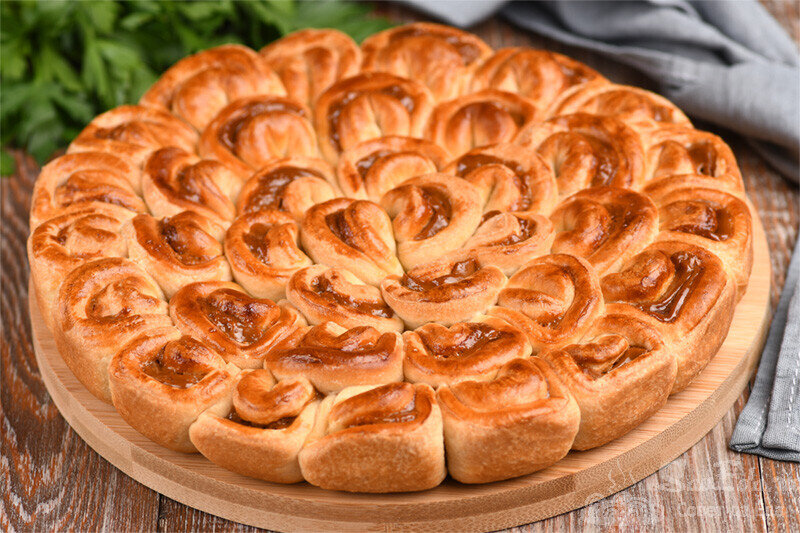 Обожаю сладкие пироги к чаю, на приготовление которых требуется минимум продуктов и времени. Для это отлично подходят жидкое заливное тесто и дрожжевое или бездрожжевое слоеное тесто, а соединять это тесто можно с разнообразными продуктами. Я использую свежие или замороженные ягоды, фрукты, варенье, джемы, сгущенное вареное молоко и шоколад. Сегодня будет очень красивый, интересный и простой в приготовлении пирог к чаю. Потребуется всего 2 продукта и немного времени на подготовку. Он получается в меру сладкий, невероятно вкусный и ароматный. В готовом виде его даже разрезать не надо. В качестве начинки можно использовать разные продукты. Порции 5-6 Время подготовки 25 минут Время приготовления 35-40 минут Ингредиенты Инструкции 1. Для приготовления беру дрожжевое слоеное тесто (можно заменить и на бездрожжевое). В пачке 2 пласта. Раскатываем пласты теста не очень тонко и вырезаем кружочки (диаметр 7 см). Остатки теста округляем и снова раскатываем. 2. На тесто ближе к одному краю выкла