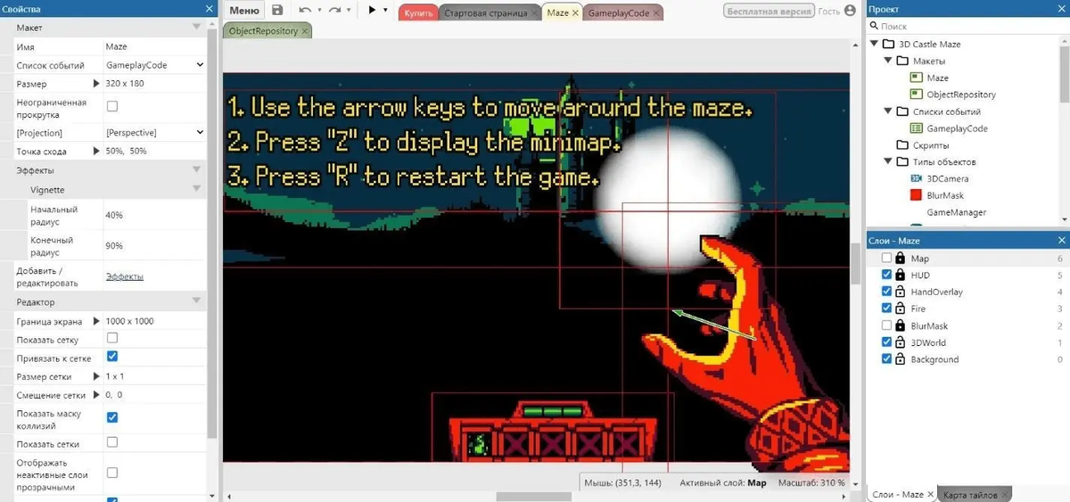 У движка есть свой код программирования GML (Game Maker Language), который увеличивает функционал. Структурно язык похож на C, довольно прост и функционален. Его легко выучить по туториалам создателей.