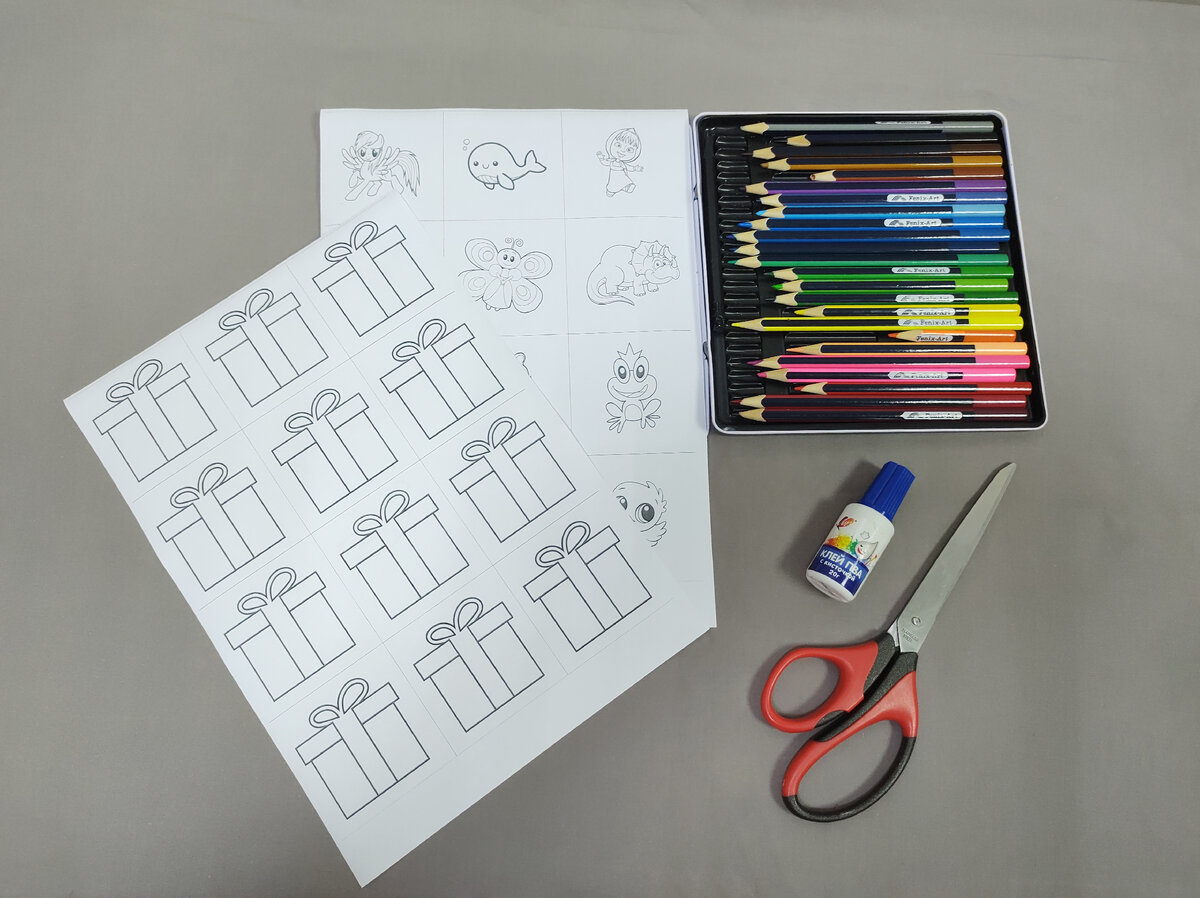 1) Бумага для принтера А4 (на ней будем печатать шаблон). 2) Цветные карандаши; 3) Клей; 5) Ножницы; Всё очень просто: пошаговая инструкция 1. Распечатываем шаблоны. Печатаем страницы с наполнением, и столько же страниц с подарочными коробками. 2. Раскрашиваем маленькие картинки с наполнением. Можно поручить это задание своим старшим помощникам. Совмещаем приятное с полезным. Можно, конечно, их сразу распечатать на цветном принтере. Но у меня такого нет. И шаблоны я подготовила именно для раскрашивания.