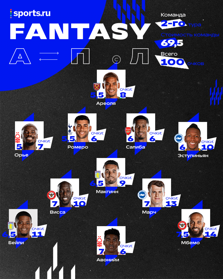 Второй тур АПЛ – без голов Холанда, но с любопытными персонажами. По каким принципам: • состав – лучшее, что можно было получить в туре, если собирать команду по фэнтези-правилам (общая стоимость – 100, максимум двое из одного клуба, при равенстве очков проходит более дешевый). • это не команда кого-то из реальных игроков и тем более не команда редакции Sports.ru • игроки на картинке расположены не как на тактической схеме, а разделены просто по позициям: на защитников-полузащитников-нападающих. Если присмотреться, можно заметить – это алфавитный порядок слева направо • очки считаем без учета капитана – потому что капитанство уже надстройка, удвоения помешали бы нам четко сравнивать туры и фэнтези-героев. Бриан Мбемо, «Брентфорд» (8,32%) – 14 очков Против «Фулхэма» – два гола, один из них с пенальти. Мбемо, кстати, исполняет еще и угловые. Вместе с Йоаном Висса очень достойно заменяют дисквалифицированного Айвена Тоуни. Два тура – два попадания в сборную. Солли Марч, «Брайтон» (6,53%)