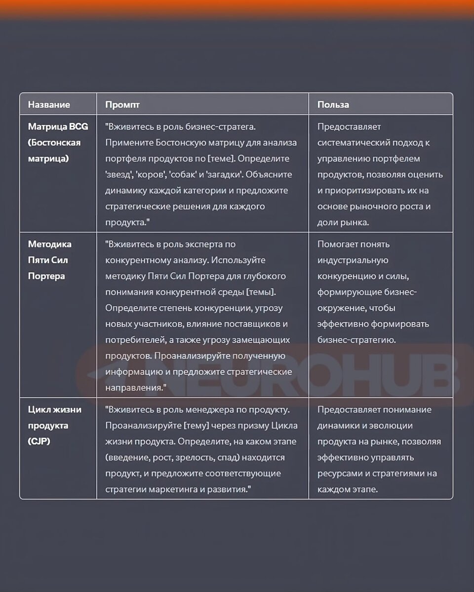 Они охватывают многие аспекты развития бизнеса: помогут определить стратегии роста, провести анализ конкурентов и сэкономить ваше время. Больше интересного контента в телеграм-канале Neurohub.