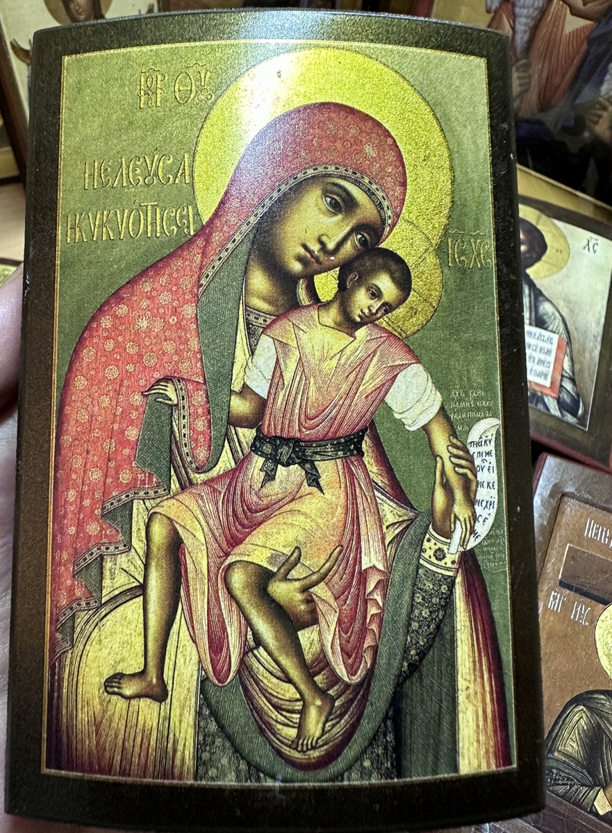 Икона Богородицы Киккская редко представлена в храмах. Но увидев ее однажды, не спутаешь с другими образами. Только на этом образе Младенец, играючи, отвернулся от дорогого Ему Лика. Богородица в Свою очередь, смотрит на играющего Младенца и придерживает Его руками, как бы пытаясь отгородить от будущего, о котором Она только догадывается.