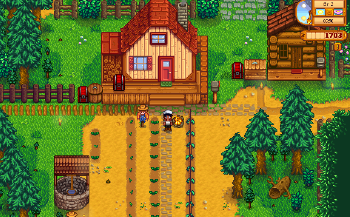 На первый взгляд обычная пиксельная инди игра для девочек про посадку растений в огород, а на деле одна из лучших игр 2016 года, которая до сих пор висит в лидерах продаж в Steam. Но внешность бывает обманчива, и под капотом у этой игры довольно сложная RPG-система, в которой нашлось место прокачке навыков как в ведьмаке. На каждом уровне прокачки определённого навыка открываются новые вещи для крафта. Вся игра представляет собой жизнь фермера в разные времена года по дням, то есть геймплей зимой в край отличается от геймплея летом, т.к никакие растения не растут зимой и т.п. Целью игры является зарабатывание монет, путём: Главным плюсом игры является связка из всех механик игры. Сельское хозяйство, не так эффективно без исследования шахт, а чтобы безопасно их исследовать, нужно много еды => много ингредиентов, которые можно получить, если у вас есть домашний скот. Помимо заработка игрок может заняться повышением отношений с NPC Всего в игре 46 персонажей Это могут быть как дружес