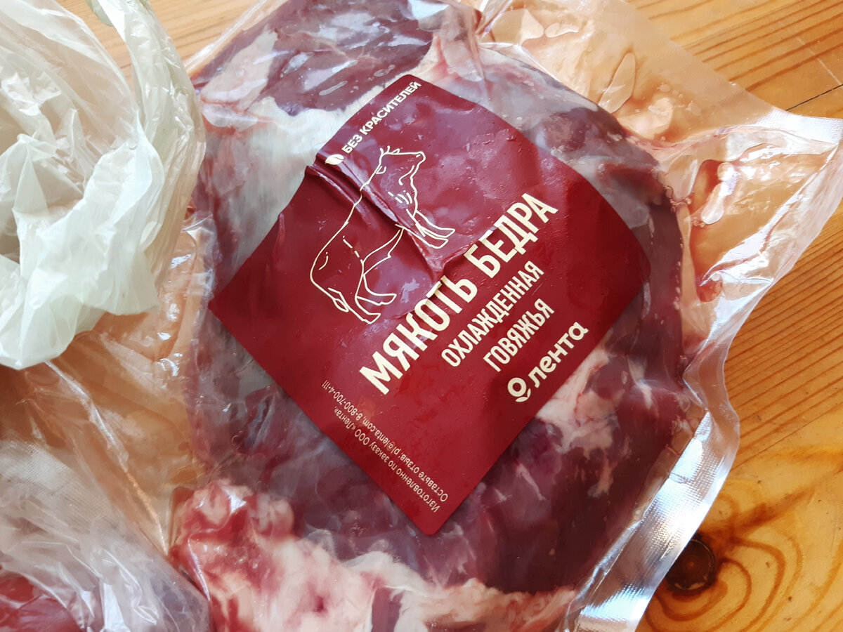 Всю говядину я покупала в Ленте с использованием промокодов (50% скидка). Тазобедренную часть в первый заказ привезли просто идеальную. Во второй заказ было немножко сухожилий, но все равно кусок отличный был. А вот эта мякоть бедра понравилась меньше, больше такую покупать не буду. По цене они почти одинаковые.