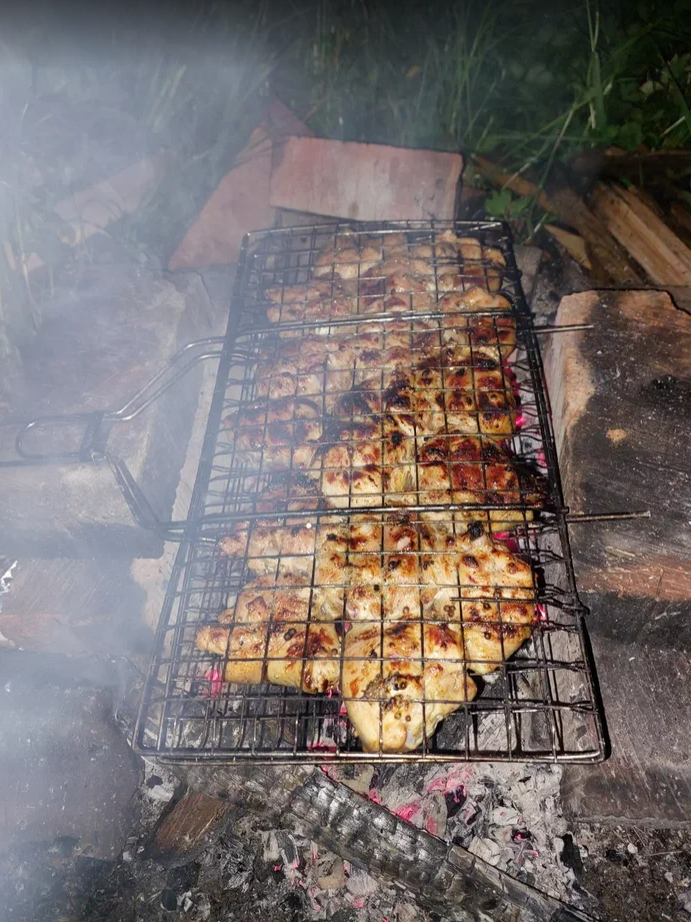 Вчера был дождь и работали в доме. Я доделывала плитку, рабочие делали канализацию, вентиляцию и начали делать короба под всё это, лазили под домом, делали утепление плиты снизу. К вечеру погода разгулялась, а узбеки решили загладить свою вину за то, что намедни оставили меня без ужина. Купили шашлык, конечно не мой любимый из свиной шеи, а из куриных голеней. Понятно, что у меня с мусульманами, вкусы разные))) Ребята трудились, и я решила сделать шашлык сама. В этом плане я старовер, люблю шашлык на дровах, идеально конечно яблоня, но у меня пока в хозяйстве сухих яблонь нет, а вот берёзовых дров полно, остались от расчистки участка, правда они были сырые, но пионерское прошлое и время работы в лагерях не прошли даром, обычно разжигаю костёр с одной спички. Как водится, мужчины в мои возможности поверили не сразу. У них ещё была работа, я только попросила расколоть мне берёзовые чурки пополам, колуна не было, а маленьким топориком у меня не вышло, у прораба получилось. Соорудила доми