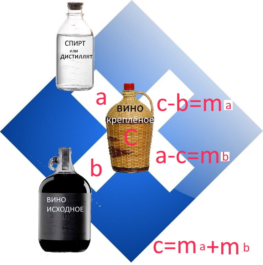 Скоро снимать урожай винограда и делать вино. Некоторые предпочитают вина десертные. Иные сорта винограда, например, мускатные очень выигрывают именно в десертных винах. Поскольку мускатные букеты в сухих винах не сохраняются, по крайней мере, длительное время. А десертные вина, кроме добавления сахара, требуют крепления – добавления этилового спирта или дистиллята до крепости16 и более градусов (об.%). И тогда винодел сталкивается с задачей: как рассчитать объемы, чтобы получить требуемый результат. Ранее я публиковал упрощенную формулу крепления. Теперь предлагаю более точную. Задача решается просто, если использовать «правило креста», которое позволяет определить массовые доли вина и алкоголя для получения вина крепленого. Надо отметить, что корректно правило креста работает именно для массовых долей. Но мы будем использовать миллилитры, заменяя ими граммы, пренебрегая той небольшой погрешностью, которая будет иметь место. Правило креста наглядно изображено на этом рисунке Здесь a