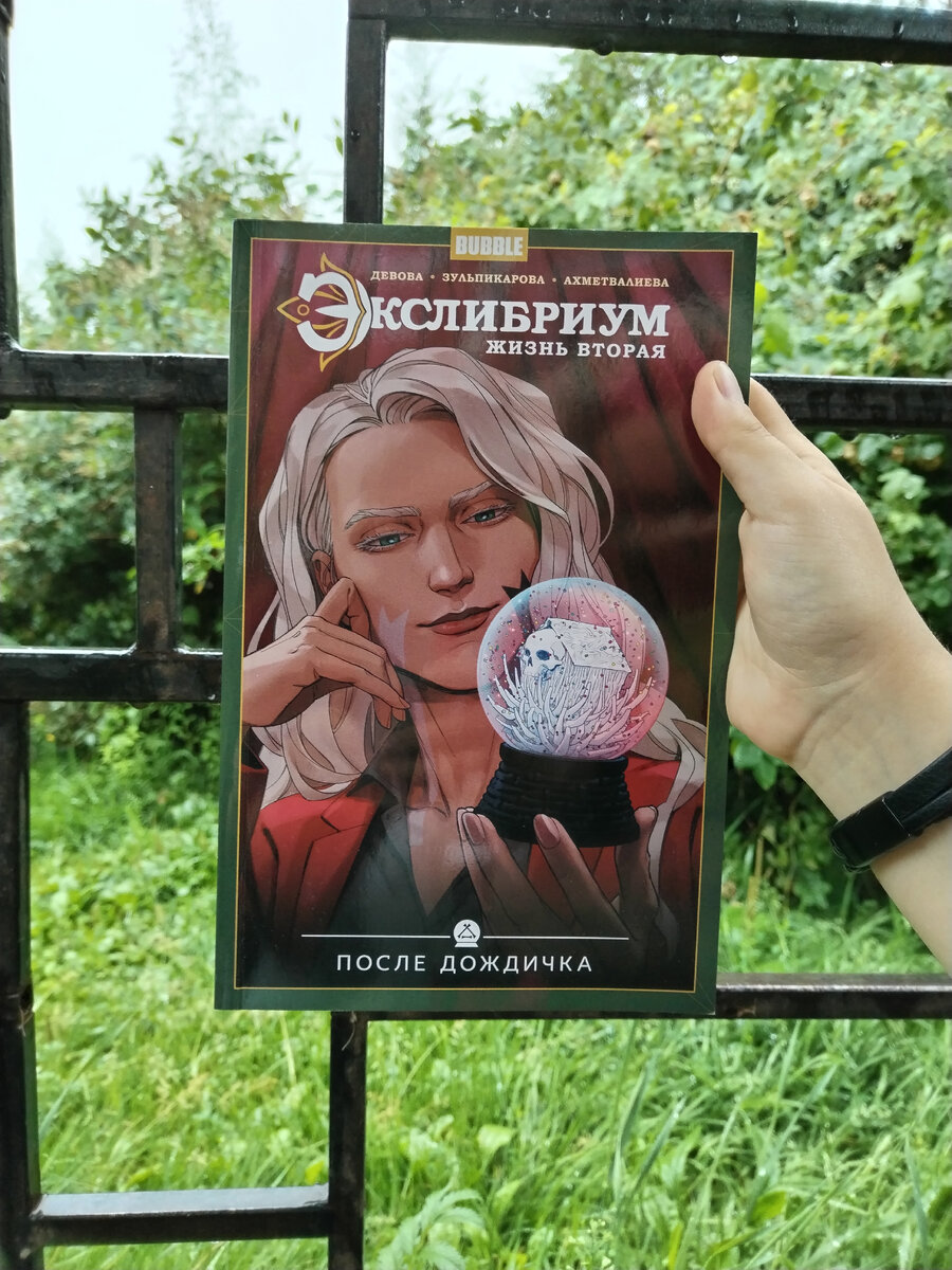 Восьмой том содержит выпуски "Экслибриума. Жизнь вторая" №33-36("После дождичка"), скетчи, концепты и эскизы персонажей. Цвета стали ярче и заметно просела рисовка, чего только стоит однотонный голубой фон на протяжении всего тома или упрощение детализации одежды, у персонажей увеличились глаза из-за чего они стали выглядеть моложе